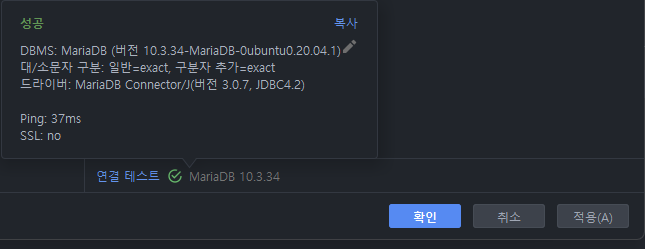 작성 후 연결 테스트를 눌러보았을 때 성공한다면 다음과 같이 뜨고 실패한다면 실패라고 뜬다.