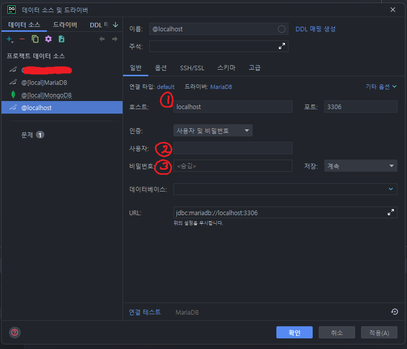 비밀번호는 앞에서 입력했던 MariaDB의 비밀번호를 입력하면 된다.